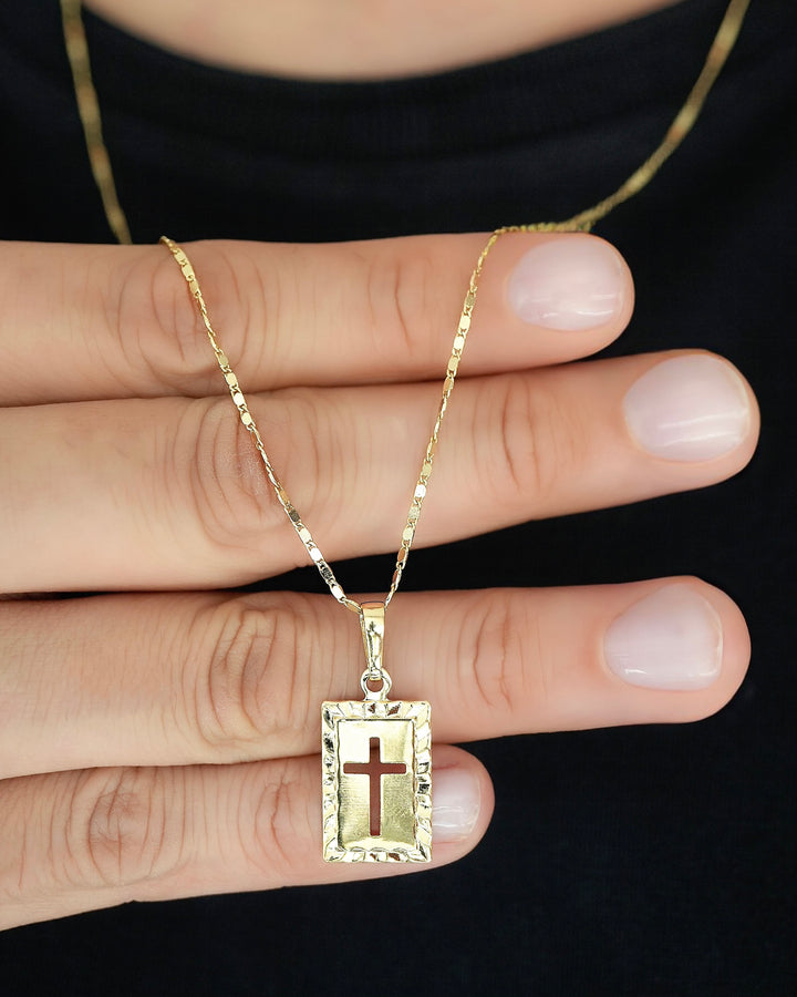 Luce tu fe con estilo y elegancia con el dije “PLACA CRUZ DIAMANTADA”, elaborado en oro laminado de 18K. Su diseño rectangular con una cruz central realzada y borde tallado refleja fuerza, espiritualidad y sofisticación. Ideal para quienes desean llevar un símbolo de protección y esperanza siempre cerca del corazón.