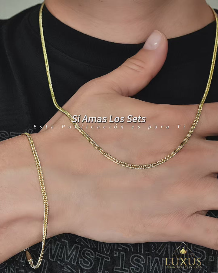 Luce el combo perfecto con nuestro nuevo set que incluye una cadena de 60 cm y una pulsera a juego, elaboradas en oro laminado de 18k con diseño moderno y elegante.