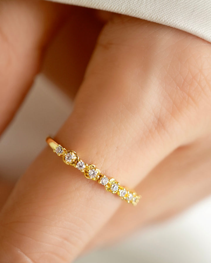El anillo “GARDEN CRISTAL” es la pieza perfecta para quienes aman un brillo sutil, limpio y sofisticado. Su diseño delicado combina una base dorada con una hilera de cristales blancos que aportan un destello elegante y versátil, ideal para elevar cualquier look con un toque de luz.